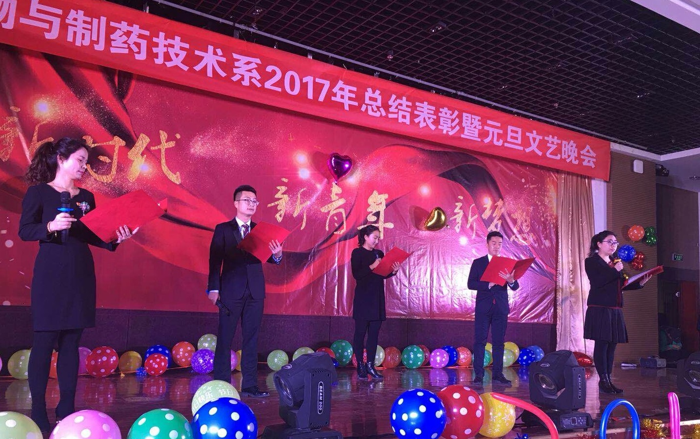 12月29日晚6点,生物与制药技术系2017年总结表彰暨“新时代 新青年 新梦想”元旦文艺晚会在竞贤楼三楼隆重举行。系领导班子、教研室主任、青年教师、在校员工、顶岗实习员工、兄弟院系员工代表等400余人观看了文艺晚会。