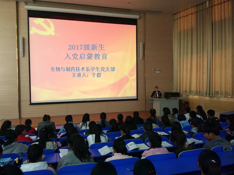 为了提高老员工党性觉悟,树立正确的政治观念,宣传党的光辉历史,弘扬党的精神,10月24日生物与制药技术系员工党支部在一楼阶梯教室开展新生入党启蒙教育活动,2017级240余名新生参加。