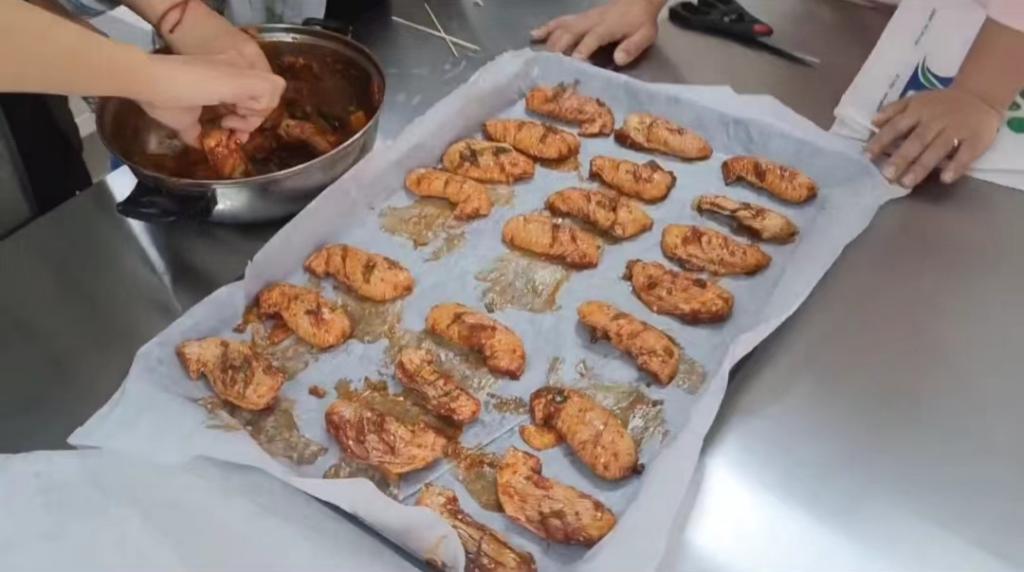 在实践操作环节中,崔老师带领员工制作羊肉丸子、酱牛肉、五香鸡爪、烤鸡翅、酸奶等产品,并针对酱卤肉制品、烘烤、干燥和保藏等关键技术进行了讲解,寓教于乐,给每位员工实际操作的机会,帮助学生快速掌握肉制品、乳制品加工技能。随后,员工们对亲手制作出的产品进行了感官评定。