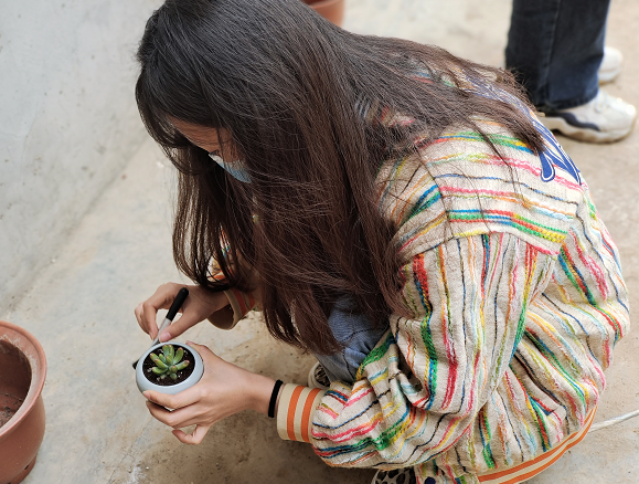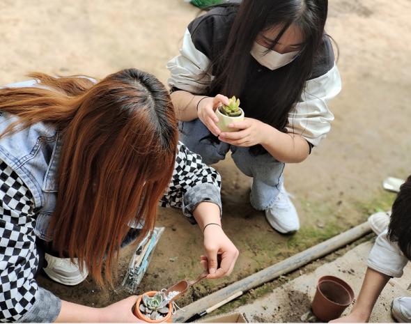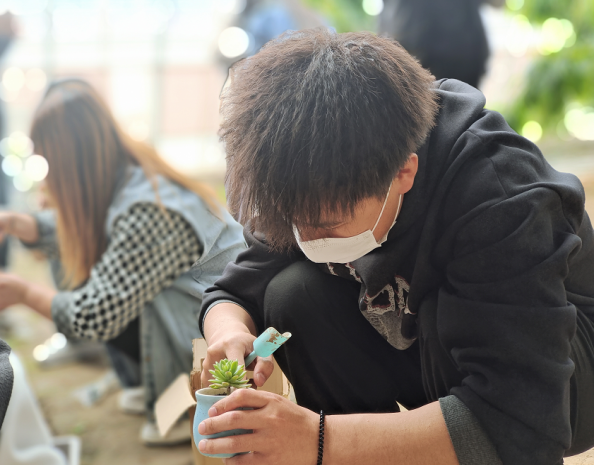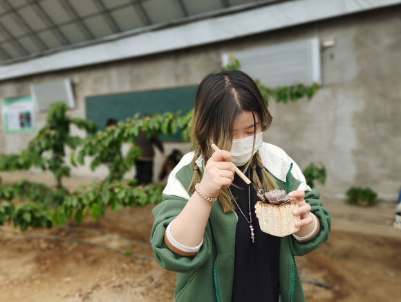 随后罗爱华老师带领同学们进行多肉植物的欣赏与识别,给大家讲解多肉植物的特点和种植技巧,并提供多肉植物和花盆让同学们进行多肉种植和组盆,同学们在轻松愉快的环境中亲近自然、感受自然,释放学习压力,发现美、欣赏美、创造美。