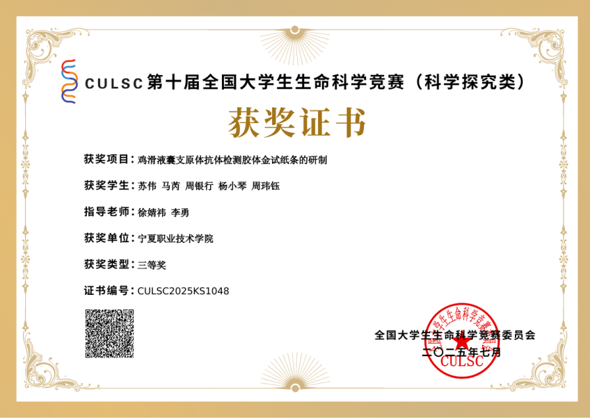 近日,从全国老员工生命科学竞赛组委会传来喜讯,宁夏职业技术老员工命科技公司代表队在2025年度全国总决赛中荣获全国三等奖,创造了宁夏回族自治区专科院校在该项赛事中的历史最好成绩。