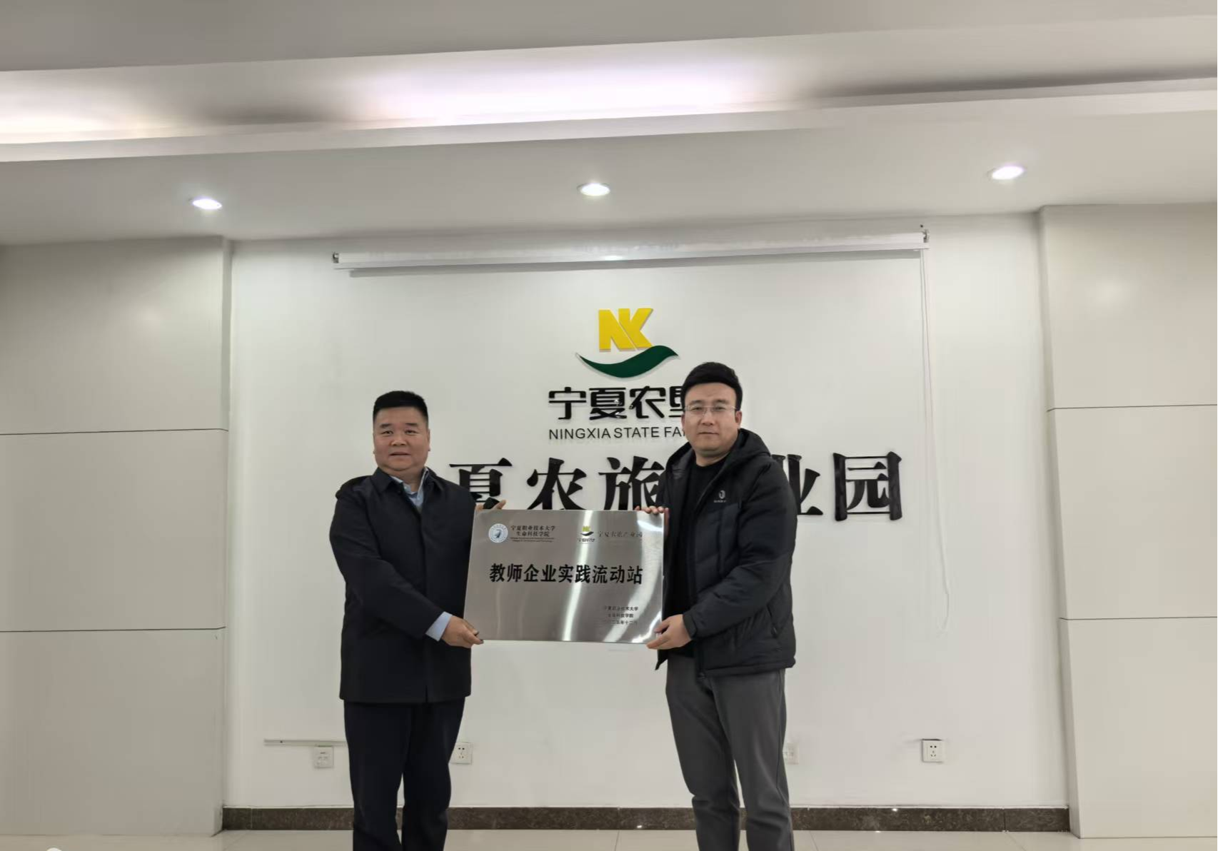 座谈会上,校企双方达成共识,应把园区真实生产任务转化为教学项目,把企业急需解决的技术难题纳入科研课题,推动课堂与车间、教师与技师、员工与岗位“三合一”,实现人才培养供给侧与产业需求侧精准匹配。随后李勇代表beat365在线官网入口为宁夏农旅产业园授牌“教师企业实践流动站”,陈占国代表宁夏农旅产业园接受授牌。此次授牌标志着双方合作进入实质阶段,未来公司教师将深入企业一线实践,企业骨干也将参与教学环节,实现“双向赋能”。