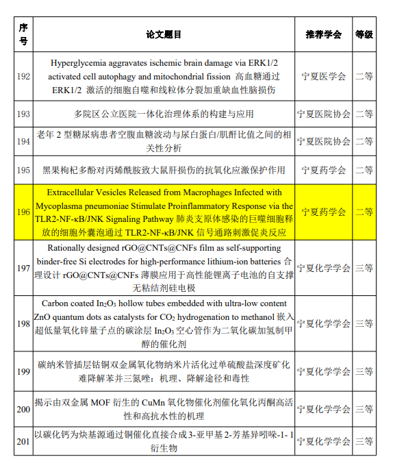 近日,经宁夏药学会推荐,自治区科协组织评选,公司制药教研室李军教授以一作发表的北大核心期刊论文(CSCD收录)《应用种子形态及 DNA 条形码技术鉴定黄芪及混伪品种子》和马春骥副教授以一作发表的SCI期刊论文(中国科公司二区Top,影响因子6.208)《Extracellular Vesicles Released from Macrophages Infected with Mycoplasma pneumoniae Stimulate Proinflammatory Response via the TLR2-NF-κB/JNK Signaling Pathway》(肺炎支原体感染的巨噬细胞释放的细胞外囊泡通过TLR2-NF-κB/JNK信号通路刺激促炎反应)分获第十七届宁夏自然科学优秀学术论文一、二等奖。本次两位教师同在一届全区自然科学研究领域获奖,这是自2020年公司组建beat365在线官网入口以来的首次,也标志着公司科研工作成绩再上新台阶。
