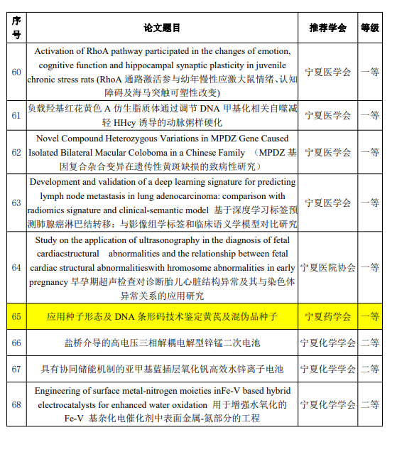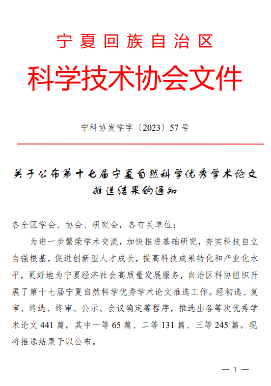 本次评选经科研人员所在单位推荐、各专业学会初选、宁夏回族自治区科学技术协会终选后,共推选出优秀学术论文441篇,其中一等65篇、二等131篇、三等245篇。