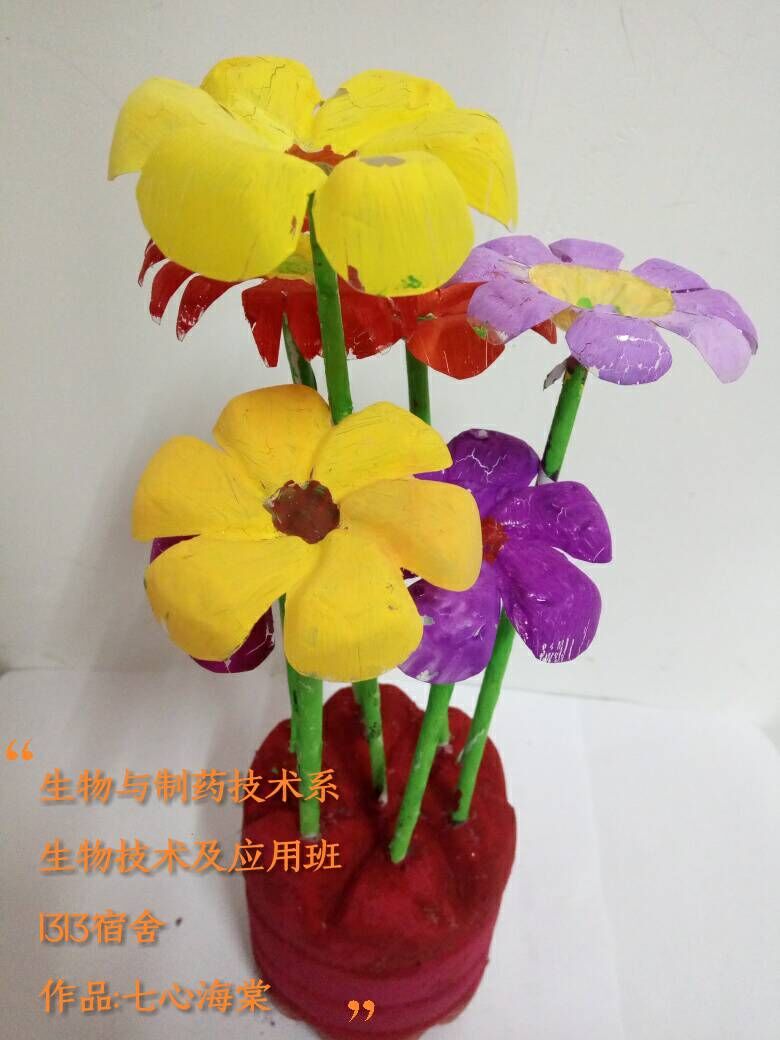 阳光寝室,阳光环保。为了鼓励同学们厉行节约,变废为宝,用废弃材料妆扮自己的“小窝”。4月1日-4月15日,生物与制药技术系在全系宿舍范围开展了以“绿色创意,低碳生活”为主题的小发明,小制作展示活动。活动中同学们利用废弃的饮料品、报纸、药盒、废毛线、易拉罐、口杯、旧光碟、树木种子等物品,发挥奇妙的想象力,制作出漂亮实用的装饰品,改变了原本装饰简单的宿舍样貌,使得宿舍焕然一新,拥有了生命力和活力。本次活动共收集作品20件,最终,1313宿舍用雪碧瓶和报纸创作的作品《七星海棠》、1317宿舍用树的种子创作的作品《梅》、1426宿舍用药瓶和胶囊创作的作品《风铃》荣获最佳环保创意奖。