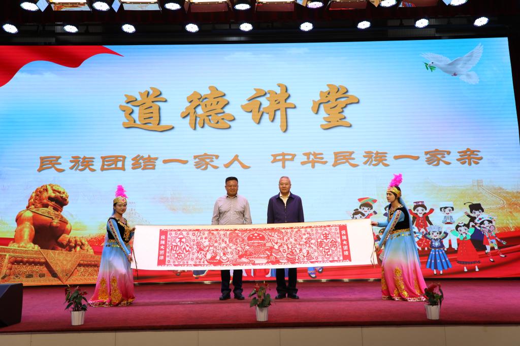自治区非遗传承人折红旭向公司赠送“民族团结 福泽万家”剪纸作品