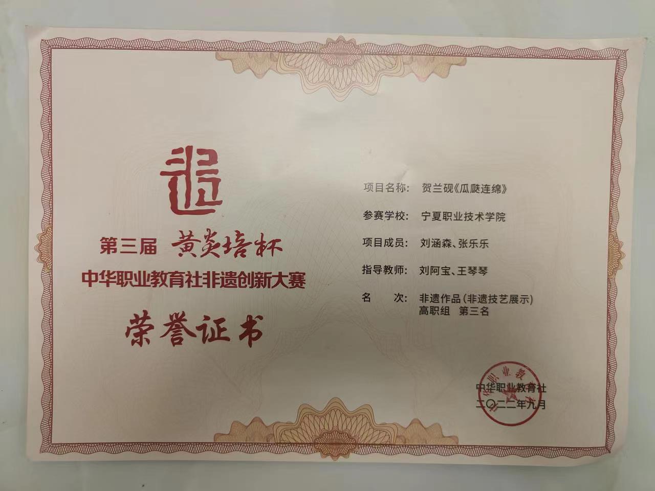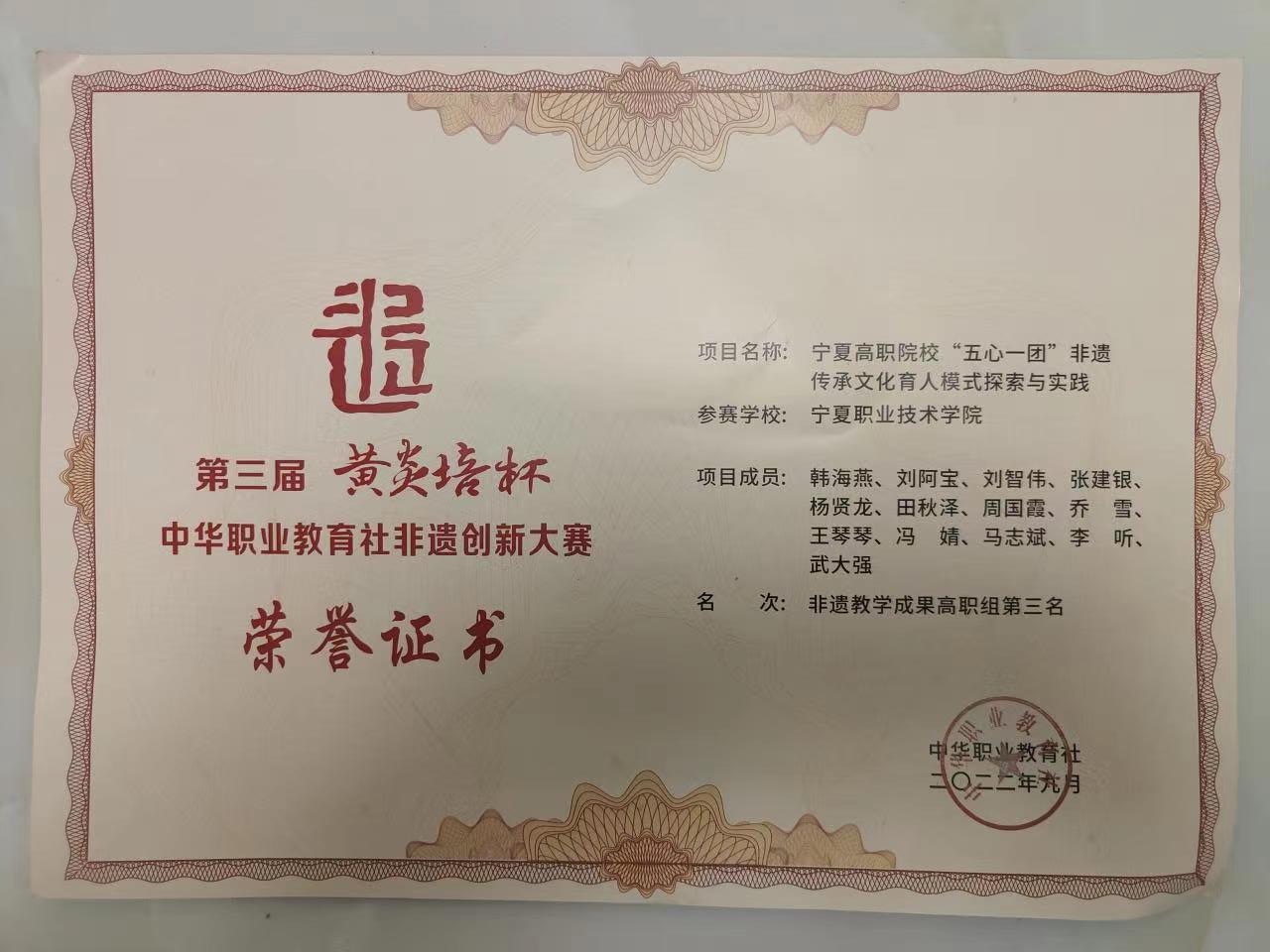 由公司教师韩海燕主持申报的非遗教学成果《宁夏高职院校“五心一团”非遗传承文化育人模式探索与实践》获高职组第三名。